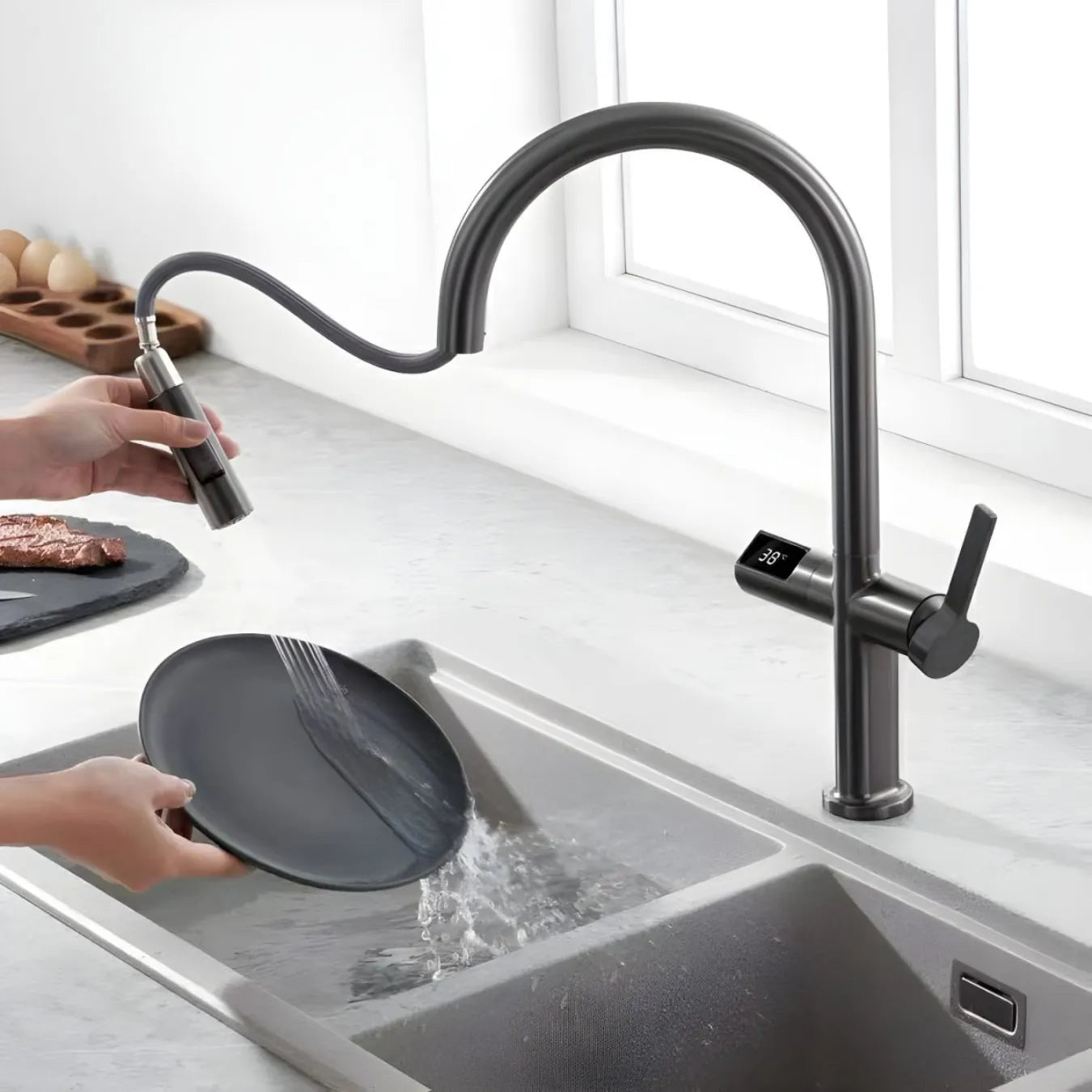 The pull-down spray reaches exactly where you need it, the temperature display eliminates the guesswork of adjusting knobs, and the dual spray mode lets you use the right pressure for the job.